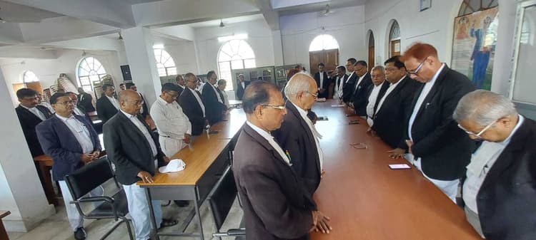 जामताड़ा कोर्ट. पहलगाम में आतंकी हमले के मारे गए सैलानियों की याद में जिला अधिवक्ता संघ ने व्यवहार न्यायालय परिसर में शोक सभा का आयोजन किया. इस दौरान अधिवक्ताओं ने दो मिनट का मौन रखा. अधिवक्ता संघ के अध्यक्ष मोहनलाल बर्मन ने कहा कि आतंकवादियों की यह कायराना हमला मानवता के विरुद्ध है. हत्या का यह घटना बहुत दुखद है. मृतक के परिजनों के साथ हम सभी खड़े हैं. उनके इस दुखद घड़ी में ईश्वर सबको हौंसला और शांति दें. वरीय अधिवक्ता सुमित्रा सरकार ने कहा कि यह चूक इंटेलिजेंस की चूक है वह लोकल प्रशासन की. इस कारण आतंकवादी इतने बड़े हादसा कर बैठे. पूरे विश्व में आतंकवाद का खात्मा होना चाहिए. मौके पर उपाध्यक्ष मनोज कुमार सिंह, सचिव अरबिंदो सरकार, सतीनाथ मंडल, अभिजीत बॉस, उमेश भैया, महेंद्र बर्मन, श्याम शंकर यादव, मुक्ता मंडल, लक्ष्मी दुबे, पुष्पा दुबे, संजय बर्मन, सुब्रतो मुखर्जी आदि अधिवक्ता मौजूद थे.