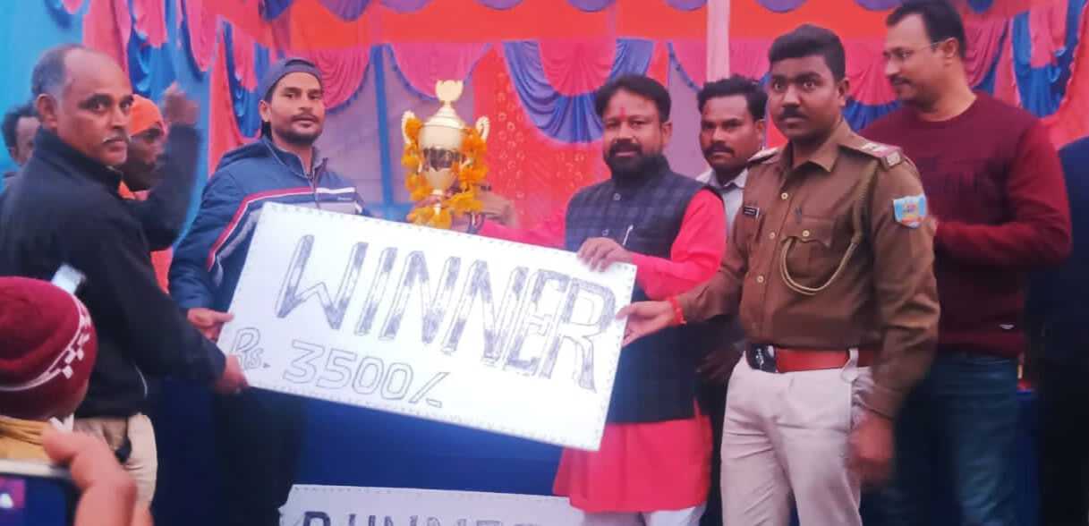 फतेहपुर. मकर संक्रांति पर सिंह ब्रदर्स आराई की ओर से आराई क्रिकेट ग्राउंड में एक दिवसीय क्रिकेट टूर्नामेंट का आयोजन किया गया. टूर्नामेंट में कुल 8 टीमों ने भाग लिया. फाइनल मुकाबला अमित-11 बनाम कंचन-11 के बीच खेला गया, जिसमें अमित-11 ने जीत दर्ज की. समाजसेवी मनोज गोस्वामी ने विजेता टीम को ट्रॉफी एवं नकद 3500 रुपये देकर पुरस्कृत किया एवं उपविजेता कंचन- 11 को जामजोड़ी पंचायत की मुखिया प्रमिला मुर्मू ने ट्रॉफी एवं नकद 3000 रुपए देकर पुरस्कृत किया. बेहतरीन खेल का प्रदर्शन करने के लिए प्रभात कुमार को मैन ऑफ द मैच का पुरस्कार फतेहपुर थाने के संतोष गोस्वामी ने दिया. टूर्नामेंट में सबसे बेहतरीन प्रदर्शन करने के लिए बुलेट को मैन ऑफ द टूर्नामेंट का पुरस्कार फतेहपुर थाना प्रभारी रंजीत प्रसाद गुप्ता ने दिया. मौके पर पंचायत समिति तपन कुमार मोची, बबलू मोची सहित सिंह ब्रदर्स के सभी सदस्यों मौजूद थे.