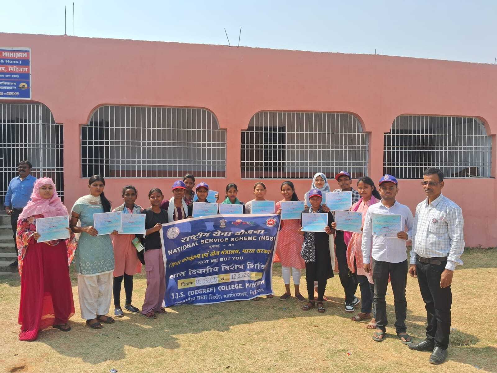 मिहिजाम. जनजातीय संध्या डिग्री महाविद्यालय मिहिजाम में एनएसएस का पिछले सात दिनों से चल रहे विशेष शिविर बुधवार को समापन हुआ. शिविर के समापन पर महाविद्यालय में प्रमाण-पत्र वितरण सह होली मिलन समारोह का आयोजन किया गया. अंतिम दिन स्वच्छता व साइबर सतर्कता पर गोद लिए गांव में जागरुकता अभियान चलाया गया था. कॉलेज प्रांगण में स्वयंसेवकों व सेविकाओं को प्रमाण-पत्र प्रदान किया गया. कॉलेज के प्राचार्य प्रो कृष्ण मोहन साह, नैक के को-ऑर्डिनेटर डॉ राकेश रंजन, आइक्यूएसी को-ऑर्डिनेटर डॉ सोमेन सरकार, एनएसएस इकाई- 01 के पदाधिकारी रंजीत यादव, इकाई- 02 पदाधिकारी देवकी पंजियारा ने वोलेंटियर्स को प्रमाण पत्र प्रदान किया. शिक्षकों ने होली मिलन समारोह का आयोजन कर एक दूसरे को अबीर लगाकर होली की बधाइयां दी. मौके पर अमिता सिंह, पुष्पा टोप्पो, शबनम खातुन, शंभू सिंह, बास्कीनाथ प्रसाद, अरविंद सिन्हा, दिनेश किस्कू, रेखा शर्मा, अभिजित सिंह खड़तोल, राजकुमार मिस्त्री, दिनेश रजक आदि थे.