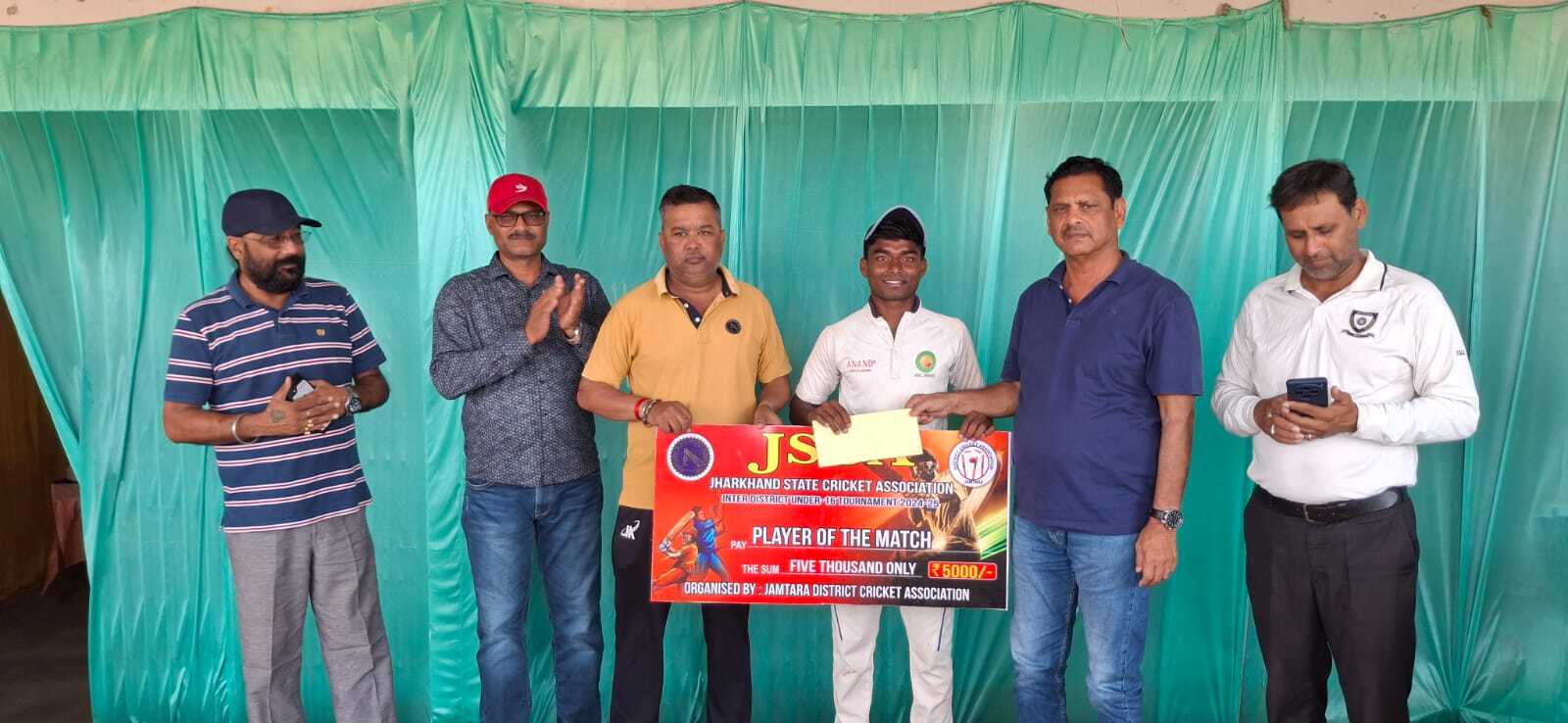 संवाददाता, जामताड़ा: जामताड़ा जिला क्रिकेट संघ के तत्वावधान में आयोजित झारखंड राज्य क्रिकेट संघ अंडर-16 लीग का पांचवां मैच धनबाद और गोड्डा के बीच खेला गया. इस मुकाबले में धनबाद ने टॉस जीतकर पहले गेंदबाज़ी करने का निर्णय लिया. गोड्डा की टीम ने पहले बल्लेबाज़ी करते हुए मात्र 24.3 ओवर में 52 रन बनाकर अपनी पूरी पारी गवां दी. जवाब में धनबाद की टीम ने शानदार प्रदर्शन करते हुए सिर्फ 8.4 ओवर में बिना कोई विकेट खोए 53 रन बना लिए और मुकाबला 10 विकेट से अपने नाम कर लिया. मैच में बेहतरीन प्रदर्शन के लिए धनबाद के अमन सहिश को प्लेयर ऑफ द मैच चुना गया. उन्हें यह पुरस्कार जेएससीए के अंपायर उमेश पाठक द्वारा प्रदान किया गया. अमन सहिश ने 5.3 ओवर में दो मेडन डालते हुए सिर्फ 16 रन देकर 4 महत्वपूर्ण विकेट चटकाये. मैच के दौरान जेएससीए के ऑब्जर्वर अनवर मुस्तफा, अंपायर उमेश पाठक और अभिषेक उपस्थित रहे, जबकि स्कोरिंग की जिम्मेदारी परमवीर सिंह ने निभाई.