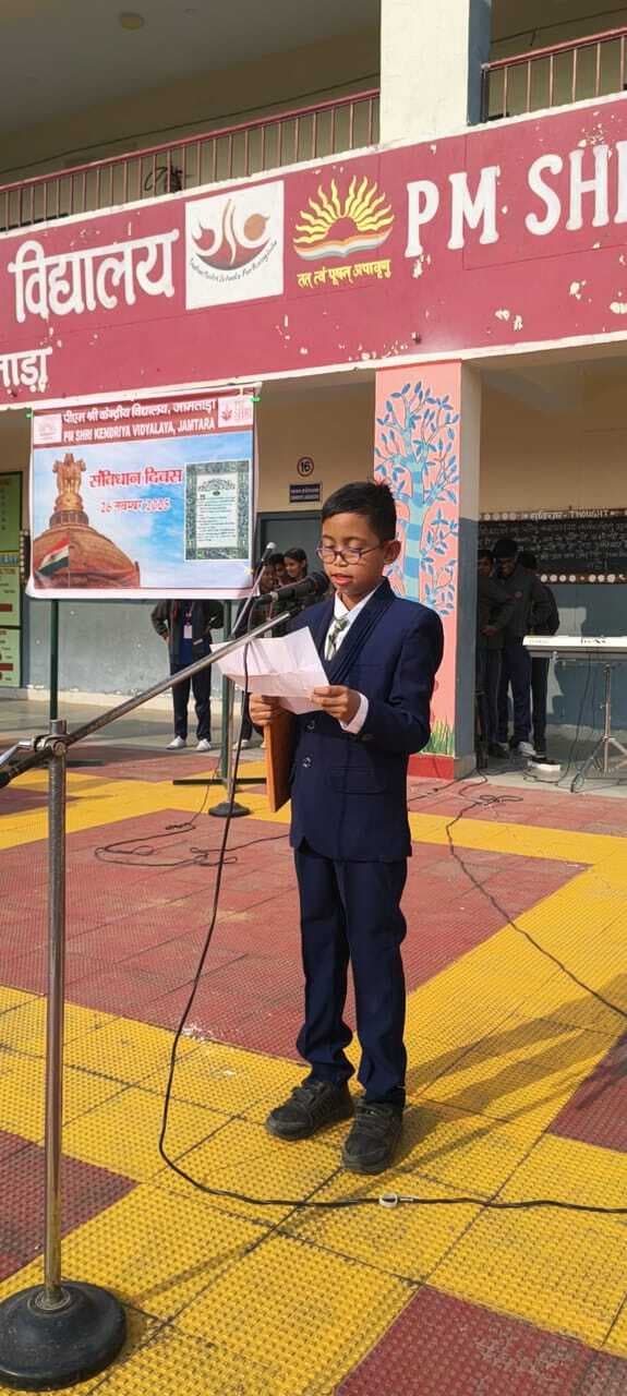 प्रतिनिधि, जामताड़ा. शहर के कायस्थपाड़ा स्थित सेंट एंथोनी स्कूल में बुधवार को संविधान दिवस मनाया गया. इस अवसर पर बाबा साहेब डॉ भीमराव आंबेडकर की प्रतिमा पर माल्यार्पण कर उन्हें श्रद्धांजलि दी गयी. छात्रों ने संविधान के उद्देशिका का सामूहिक पाठ पढ़ा. कई विद्यार्थियों ने संविधान विषय पर भाषण और निबंध प्रस्तुत किया. विद्यालय के मुख्य संरक्षक डॉ दुर्गादास भंडारी ने संविधान की उत्पत्ति, उसकी विशेषताएं और नागरिकों के अधिकार व कर्तव्यों पर विस्तृत प्रकाश डाला. विद्यालय के निदेशक डॉ. चंचल भंडारी ने छात्रों को कानून के प्रति जागरूक रहने, जिम्मेदार नागरिक बनने का संदेश दिया. उप-प्राचार्य लारेब खान ने धन्यवाद ज्ञापन किया. मौके पर शैक्षणिक प्रमुख दीपक कुमार मंडल, शिक्षक उत्पल मंडल, संजय कुमार महतो, दीनबंधु सिंह, वरुण कुमार, तृषा दे, रीया माजी, मौसमी घोष, रुबीना खान, सुफिया नाज, दीपशिखा यादव, रोहित ओझा आदि थे. केवि में संविधान दिवस के महत्व पर डाला गया प्रकाश जामताड़ा. पीएम श्री केंद्रीय विद्यालय में संविधान दिवस मनाया गया. कार्यक्रम की शुरुआत कार्यवाहक प्राचार्य राम स्वरूप पंडित ने बाबा साहेब के चित्र पर माल्यार्पण कर की. शिक्षक अंकित शुक्ला ने संविधान दिवस के महत्व पर प्रकाश डाला. विद्यार्थियों को लोकतांत्रिक मूल्यों, अधिकारों एवं कर्तव्यों के प्रति सचेत रहने की प्रेरणा दी. कई छात्रों ने संविधान व राष्ट्रनिर्माण पर प्रभावशाली भाषण दिया, तो वहीं कई छात्रों ने कविता पाठ, नाट्य प्रस्तुति (स्किट) तथा बाबा साहेब डॉ भीमराव आंबेडकर के जीवन एवं योगदान पर आधारित मनमोहक अभिनय प्रस्तुत किया.