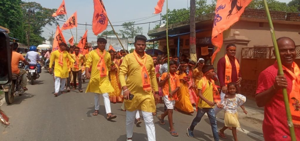 मंझलाडीह गांव में बुधवार काे मंदिर में भगवान हनुमान की प्राण प्रतिष्ठा को लेकर कलश यात्रा निकली गयी.