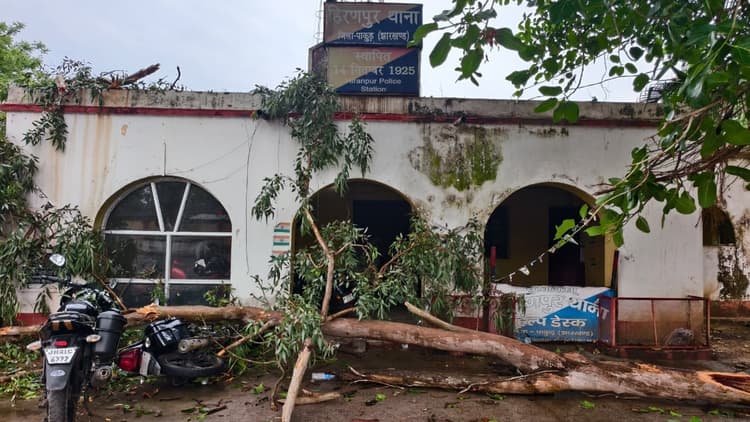 हिरणपुर. तेज हवा के कारण हिरणपुर थाना परिसर में एक पुराने बरगद के पेड़ की भारी डाली टूटकर एक बाइक पर गिर गई, जिससे बाइक क्षतिग्रस्त हो गया.