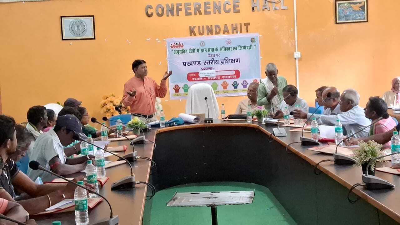 कुंडहित. पेसा अधिनियम के प्रावधानों से ग्राम प्रधानों को रूबरू कराने के लिए कुंडहित में सोमवार से दो दिवसीय प्रशिक्षण शुरू हुआ. इसका शुभारंभ बीडीओ जमाले राजा ने किया. उन्होंने बताया कि पेसा अधिनियम का उद्देश्य अनुसूचित क्षेत्रों में ग्रामसभाओं को सशक्त बनाना है. इसमें आप सबों की भूमिका काफी महत्वपूर्ण है. पंचायती राज्य विभाग के तत्वावधान में आयोजित प्रशिक्षण में उपस्थित प्रतिभागियों को अनुसूचित क्षेत्र के ग्रामसभा के अधिकार एवं दायित्वों के बारे में जानकारी दी गई. प्रशिक्षक सोहराब अली ने बताया कि प्रशिक्षण का मुख्य उद्देश्य अनुसूचित क्षेत्र में ग्रामसभाओं की भूमिका स्पष्ट करना व प्रतिनिधियों को उनके संवैधानिक अधिकारों एवं कर्तव्यों के प्रति जगरूक करना है. मौके पर कई ग्राम प्रधान मौजूद थे.