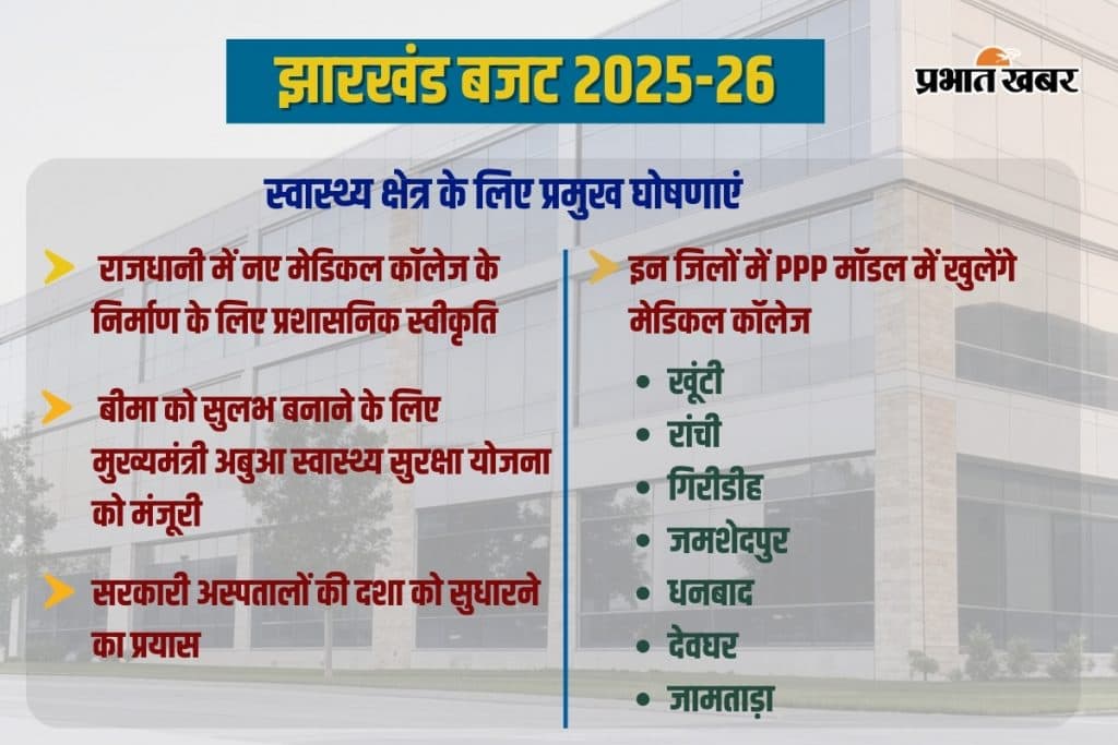 सरकार ने राज्य की राजधानी में नए मेडिकल कॉलेज और अस्पताल के निर्माण पर प्रशासनिक स्वीकृति दे दी है. इसके अलावा, पब्लिक प्राइवेट पार्टनरशिप (PPP) मॉडल पर राज्य के कुल 6 जिलों में मेडिकल कॉलेज के निर्माण का प्रस्ताव पारित किया है, जिसमें खूंटी, गिरीडीह, जमशेदपुर, धनबाद, देवघर और जामताड़ा जिला शामिल है.