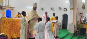 खूंटी. संत मिखाइल चर्च के डीकन एग्नेस नाग और जीवन कंडुलना फादर बनेंगे. इसे लेकर रविवार को संत मिखाइल महागिरजाघर में उपयाजकीय अभिषेक का आयोजन किया गया. जिसमें सुबह बिशप विनय कंडुलना की अगुवाई में पवित्र मिस्सा का आयोजन किया गया. इसके बाद उजयाजकीय अभिषेक किया गया. बिशप विनय कंडुलना ने दोनों पुरोहित को ब्रह्मचर्य की प्रतिबद्धता और अविवाहित रहने का संकल्प दिलाया. उन्होंने स्टॉल ऑल दलमाटिक कपड़ा पहनाया. उन्हें पवित्र बाइबल सौंपकर शांति चुंबन किया. बिशप ने उनका अभिषेक किया. इसके अलावा अन्य प्रक्रियाओं को पूरा किया. बिशप ने उन्हें दूसरों की सेवा करने और वेदी का सेवक बन कर सुसमाचार पढ़ कर सुनाने के लिए कहा. एग्नेस नाग मारंगहादा के रहने वाले हैं. उन्होंने रांची के संत अलबर्ट कॉलेज से पढ़ाई किया. वहीं जीवन कंडुलना पिडुल के रहने वाले हैं. उन्होंने जालंधर से पढ़ाई किया है. उपयाजकीय अभिषेक फादर बनने के लिए प्रथम सीढ़ी है. इसके छह माह बाद दोनों पुरोहित फादर बनेंगे. कार्यक्रम में मुख्य रूप से बिकर जनरल फादर बिशु बेंजामिन आइंद, फादर बेनेडिक्ट बारला, निकोलस हुन्नी पूर्ति, सुरेश समद, संदीप कंडुलना, आकाश, विजय मिंज, अजीत केरकेट्टा, अमित बारला, जेवियर तोपनो, विजय ढोढराय, संजय सुरीन, मनीष बारला, मसीह प्रकाश सोय, जॉर्ज हेमरोम, अनूप गुड़िया, अंथोनी सोय सहित अन्य उपस्थित थे.