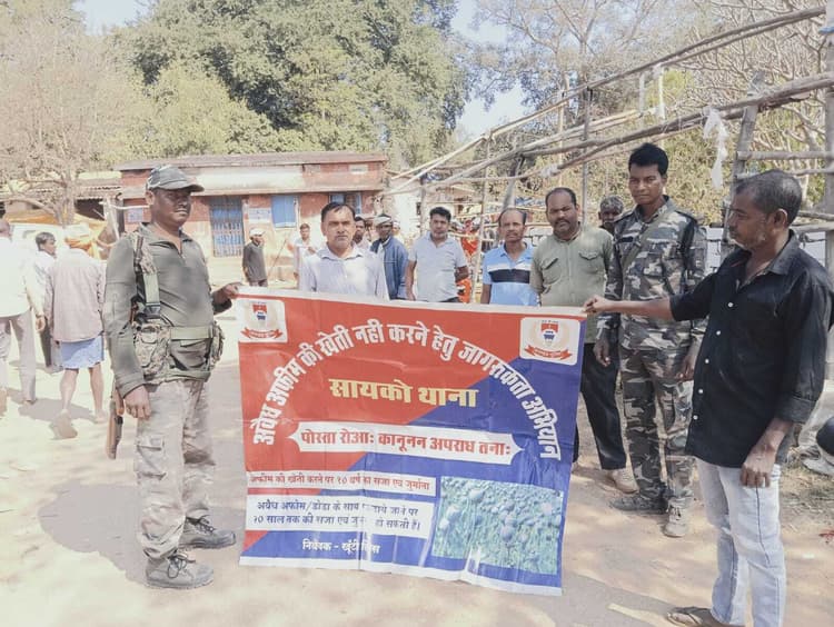 जिले में अफीम की खेती के खिलाफ लगातार जागरूकता अभियान चलाया जा रहा है. इसके तहत शुक्रवार को सायको थाना क्षेत्र के सायको बाजार में जागरूकता अभियान चलाया गया. ग्रामीणों को अफीम की अवैध खेती से होने वाले दुष्परिणाम के संबंध में जानकारी दी गयी. वहीं कानूनी प्रावधानों की भी जानकारी दी गयी. ग्रामीणों को अफीम की खेती नहीं करने और उसके बदले वैकल्पिक खेती अपनाने के लिए प्रेरित किया गया. इससे पहले गुरुवार को खूंटी थाना क्षेत्र के बारूडीह, घाघरा और कुदाडीह के जंगली क्षेत्र में पुलिस ने अफीम की खेती के खिलाफ अभियान चलाया. जिसमें कुल 10 एकड़ भूमि में लगे अफीम की फसल को पुलिस ने नष्ट कर दिया.