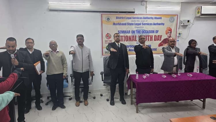 खूंटी. जिला विधिक सेवा प्राधिकार के तत्वावधान में सोमवार को डालसा सभागार में राष्ट्रीय युवा दिवस के उपलक्ष्य में स्वामी विवेकानंद के जीवनी और आदर्शों पर चर्चा की गयी. इस अवसर पर नशा उन्मूलन, नालसा डॉन योजना 2025 पर भी विचार रखे गये. प्रधान जिला एवं सत्र न्यायाधीश सह डालसा अध्यक्ष रसिकेस कुमार ने स्वामी विवेकानंद के जीवनी के बारे में बताया. वहीं सभी को नशा उन्मूलन के लिए जागरूक किया. कार्यक्रम में एनडीपीपीएस और मादक पदार्थों के रोकथाम और कानूनी पहलुओं पर भी जानकारी की गयी. इस अवसर पर डालसा के द्वारा कस्तूरबा गांधी आवासीय बालिका विद्यालय की छात्राओं के बीच नशा उन्मूलन पर पेंटिंग और निबंध प्रतियोगिता का आयोजन किया गया. जिसमें विजयी छात्राओं को पुरस्कृत किया गया. इस अवसर पर जिला जज प्रथम राकेश कुमार मिश्र, मुख्य न्यायिक दंडाधिकारी अर्जुन साव, अनुमंडलीय न्यायिक दंडाधिकारी विद्यावती कुमारी, न्यायिक दंडाधिकारी प्रथम अमित आकाश सिन्हा, डॉ संजय कुजूर, एनडीपीएस थाना प्रभारी मनीदीप, बिरसा कॉलेज प्राचार्य डॉ सीके भगत सहित अन्य उपस्थित थे.