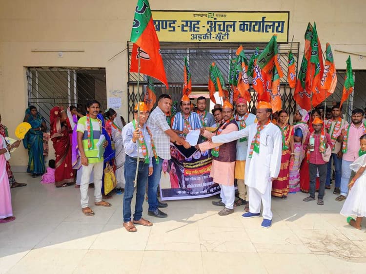 खूंटी. भारतीय जनता पार्टी अड़की मंडल अध्यक्ष परशुराम दास के नेतृत्व में मंगलवार को भाजपा कार्यकर्ताओं ने अड़की प्रखंड मुख्यालय में एक दिवसीय आक्रोश प्रदर्शन किया. उन्होंने सूर्य हांसदा एनकाउंटर, नगड़ी के कृषि योग्य भूमि में रिम्स टू के निर्माण का विरोध किया. कार्यकर्ताओं ने नारेबाजी करते हुये प्रदर्शन किया. इसके बाद बीडीओ को एक ज्ञापन सौंपा. मौके पर जिलाध्यक्ष चंद्रशेखर गुप्ता, अनुसूचित जनजाति मोर्चा जिला अध्यक्ष संजय मुंडा, रीता मुंडा, गोपाल स्वर्णकार, सुभाष हालदार, बूंदी राम मुंडा, सुरेंद्र मुंडा, बांकेलाल स्वांसी, गौरांग माझी, सच्चिदानंद तिवारी, हरिश्चंद्र मुंडा, राजू हजाम, रंजीत हजाम, विष्णु देव प्रमाणिक, अंबिका शरण हजाम, संतोष हजाम सहित अन्य उपस्थित थे.
