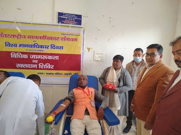 सदर अस्पताल खूंटी स्थित रक्त अधिकोष केंद्र के तत्वावधान में अंतरराष्ट्रीय मानवाधिकार संगठन के बैनर तले बुधवार को अड़की प्रखंड सह अंचल कार्यालय परिसर में रक्तदान शिविर का आयोजन किया गया. शिविर का उदघाटन डालसा सचिव खूंटी राजश्री अपर्णा कुजूर ने किया. उन्होंने कहा कि रक्तदान महादान होता है. प्रत्येक स्वस्थ व्यक्ति को अपने सामाजिक दायित्व के तहत लोगों को नयी जिंदगी प्रदान करने के लिए रक्तदान जरूर करना चाहिए. शिविर को अंतरराष्ट्रीय मानवाधिकार संगठन के राष्ट्रीय अध्यक्ष रितेश कुमार और बीडीओ गणेश महतो ने भी संबोधित किया. शिविर में कुल छह यूनिट रक्तदान किया गया. रक्तदान करने वालों को प्रमाण पत्र प्रदान किया गया. मौके पर सदर अस्पताल के उपाधीक्षक संगठन के जिलाध्यक्ष आशुतोष पुराण, समन्वयक विकेश्वर महतो, उदय कुमार साहू सहित अन्य उपस्थित थे.डिस्क्लेमर: यह प्रभात खबर समाचार पत्र की ऑटोमेटेड न्यूज फीड है. इसे प्रभात खबर डॉट कॉम की टीम ने संपादित नहीं किया है
