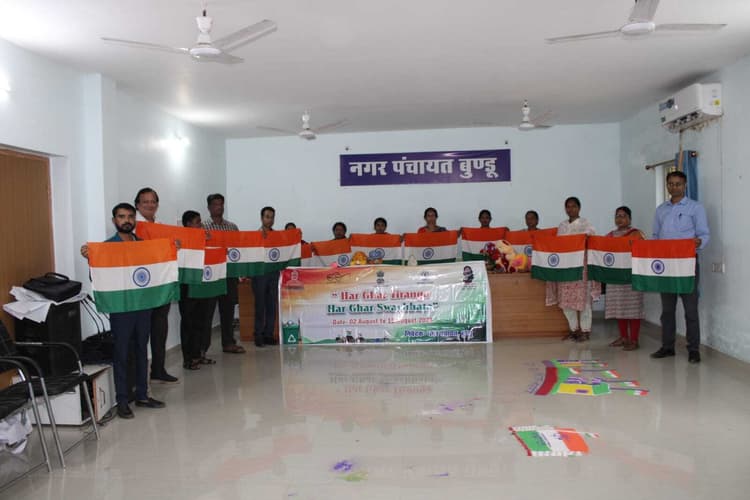 बूंडू. बुंडू में हर घर तिरंगा–हर घर स्वच्छता अभियान कार्यक्रम का आयोजन किया गया. इसमें मुख्य रूप सेनगर पंचायत के प्रशासक शुभम पोद्दार ने कहा ऐसे कार्यक्रम से स्वच्छता के साथ देशभक्ति को बढ़ावा मिलती है. महिला ने आत्मनिर्भर होकर सशक्त की ओर अग्रसर होते हैं. नगर पंचायत के कर्मियों ने महिला समूह के बीच कार्यक्रम की रूपरेखा, गतिविधियों और उद्देश्यों पर विस्तृत चर्चा की. तिरंगा थीम पर आधारित रंगोली प्रतियोगिता हुई,