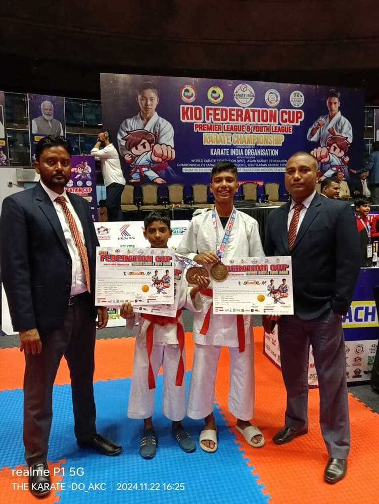 खूंटी के कराटेकारों ने फेडरेशन कप में एक स्वर्ण व एक रजत पदक जीतकर जिले का नाम रोशन किया है. तालकटोरा इनडोर स्टेडियम न्यू दिल्ली में 19 से 23 नवंबर तक चलनेवाले प्रथम फेडरेशन कप प्रीमियर लीग एंड यूथ लीग में गोजोरियो ओकिनावाकान कराटे इंडिया (खूंटी, झारखंड) के कराटेकारों ने बेहतर प्रदर्शन किया. पुरुष काता 13 वर्ष के इवेंट में अभिराज ने स्वर्ण पदक व मंटू कुमार ने 12 वर्ष काता के इवेंट में कांस्य पदक, साथ ही कुमिते 40 किलोग्राम भार वर्ग में रजत पदक प्राप्त किया. दोनों खिलाड़ियों ने पदक प्राप्त करने पर कराटे एसोसिएशन खूंटी के अध्यक्ष सह प्रशिक्षक सेंसई बिजय कुमार, सचिव सह प्रशिक्षक सेंसई रोहित राज सहित एसोसिएशन के सदस्य सुमंती गुड़िया, बेनेडिक्ट बारला, कृष्ण मोहन कुमार, संजय कुमार साहू, सतीश कुमार शर्मा, गोडविन तोपनो, प्रकाश कुमार राम, अमित कुमार सिंह, ममता सुब्बा, अमर बारला, मनोज कुमार सिंह, सुनील कुमार मिश्र, फ्रांसिस ज़ेवियर बोदरा ने ढेर सारी शुभकामनाएं व बधाई दी.डिस्क्लेमर: यह प्रभात खबर समाचार पत्र की ऑटोमेटेड न्यूज फीड है. इसे प्रभात खबर डॉट कॉम की टीम ने संपादित नहीं किया है
