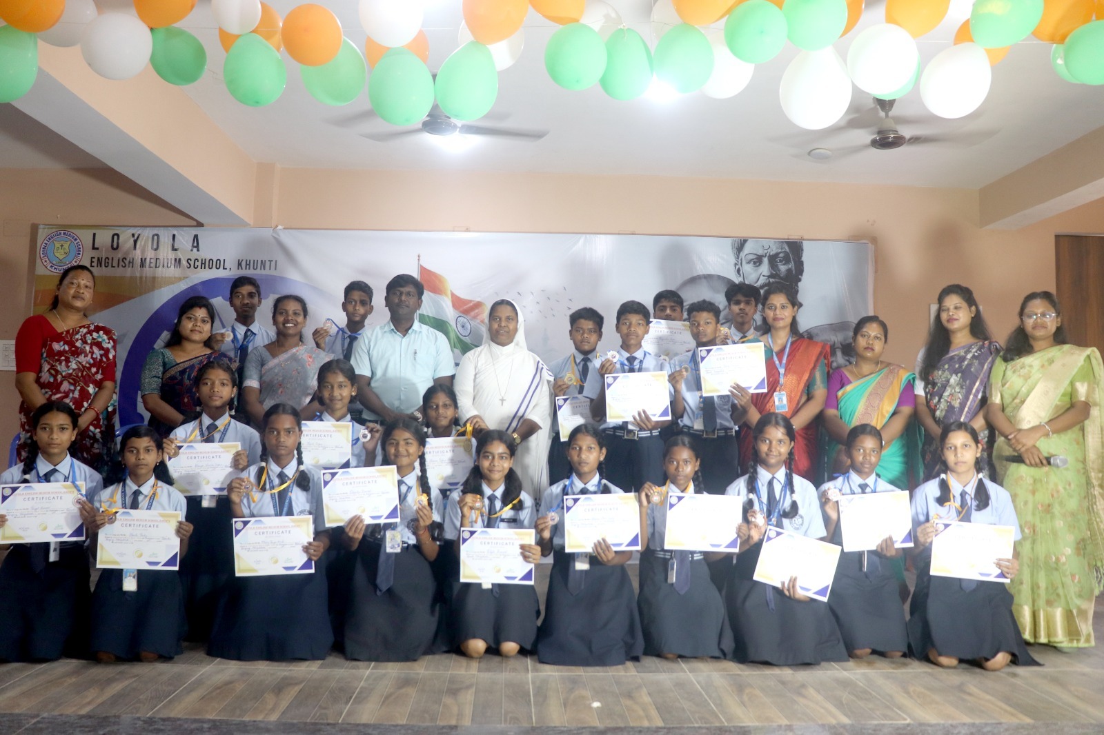 खूंटी. स्वतंत्रता दिवस के उपलक्ष्य में गुरुवार को लोयोला इंग्लिश मीडियम स्कूल में देशभक्ति हिंदी भाषण एवं गायन प्रतियोगिता का आयोजन किया गया. कार्यक्रम में मुख्य अतिथि प्राचार्य फादर सुमन प्रभात टोप्पो उपस्थित रहे. इस अवसर पर उन्होंने बच्चों को स्वतंत्रता सेनानियों के बलिदानों के बारे में याद दिलाया और उनसे एक बेहतर भारत बनाने का संकल्प लिया. कार्यक्रम में छात्रों ने देशभक्ति की भावना से ओत-प्रोत भाषण और गीत प्रस्तुत कर सभी का मन मोह लिया. प्रतियोगिता में भाषण प्रतियोगिता में कक्षा छह में प्रथम प्रिया टूटी, द्वितीय अलिशा श्वेता, कक्षा सात में प्रथम सायरस लकड़ा और द्वितीय ओम प्रकाश महतो, कक्षा आठ में प्रथम दीप्ति कुमारी और द्वितीय प्रियांशु राम, कक्षा नौ में प्रथम शेरोन सिल्विया होरो और द्वितीय नीरज मुंडा, कक्षा दस में प्रथम शिवानी कुमारी और द्वितीय युवराज कुमार रहे. गायन प्रतियोगिता में कक्षा आठ में दीपिका कुमारी, कक्षा नौ में असीम जोसेफ बिवास और कक्षा दस में सोनिया शेरोन रहे. मौके पर सिस्टर सुजीता, सिस्टर आभा सहित सभी शिक्षक-शिक्षिकाएं उपस्थित थे.