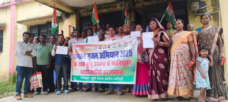 खूंटी. अखिल भारतीय कांग्रेस कमेटी के निर्देश पर संगठन सृजन अभियान 2025 के तहत शनिवार को जिला कांग्रेस कमेटी के जिला अध्यक्ष रवि मिश्रा की अध्यक्षता में मुरहू प्रखंड कांग्रेस कमेटी का पुनर्गठन किया गया. जिसमें प्रखंड अध्यक्ष अजय कुमार साहू, उपाध्यक्ष नेल्सन तिड़ू, पौलूस बोदरा, महासचिव दाउद कंडीर, करमेला सोय मुरूम, अंजू कुमारी, बिहारी राम, फिरोज खान, नामजन पूर्ति, इमानुएल नाग, विपिन मांझी, अंथोनी ओड़ेया, मंडल अध्यक्ष मुरहू पूर्वी बिनसाय मुंडा, मुरहू पश्चिमी आदित्य गंझू को बनाया गया. जिलाध्यक्ष रवि मिश्र ने सभी नवनियुक्त पदाधिकारियों को नियुक्ति पत्र प्रदान किया और उनका स्वागत किया. वहीं उन्हें संगठन को मजबूती प्रदान करने का निर्देश दिया. आदिवासी कांग्रेस के प्रदेश उपाध्यक्ष विलसन तोपनो ने भी संगठन के प्रति अपनी जिम्मेदारी को बखूबी निभाने और दिन रात संगठन के प्रति कर्तव्य निष्ठा की बातें कही. इस अवसर पर पूर्व प्रखंड अध्यक्ष पौलूस पूर्ति के कार्यों की सराहना करते हुए उन्हें जिला कमेटी में शामिल किया गया. मौके पर जिला ट्रेनिंग कोऑर्डिनेटर अंजनी रंजन, प्रदेश सहकारिता विभाग के महासचिव नईमुदीन खां, प्रखंड सांसद प्रतिनिधि मुरहू धर्मदास कंडीर, तलहा खां, अशोक महतो, सोनू, विमल सहित अन्य उपस्थित थे.