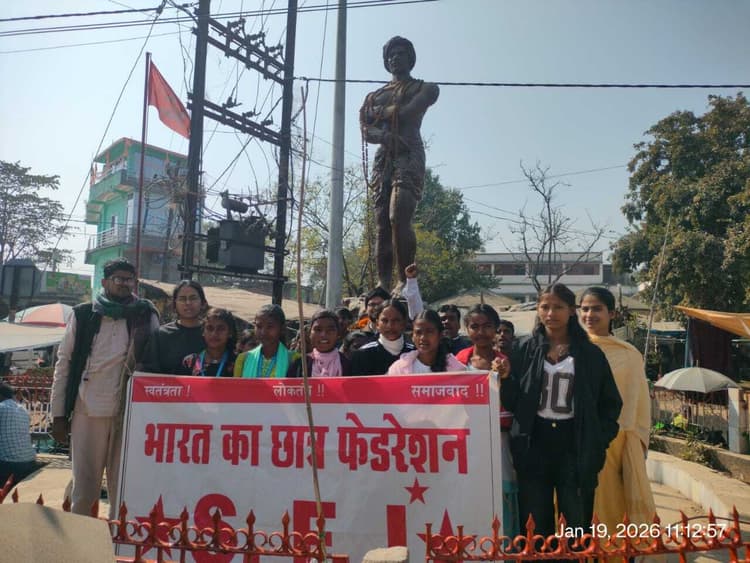 बुंडू. स्टूडेंट फेडरेशन ऑफ इंडिया की पंच परगना इकाई की बैठक बुंडू स्थित कुशवाहा धर्मशाला में संपन्न हुई. बैठक में मुख्य रूप से जवाहरलाल नेहरू विश्वविद्यालय के पूर्व छात्र संघ अध्यक्ष सह केंद्रीय कमेटी सदस्य आईसी घोष बुंडू पहुंची बुंडू बिरसा चौक में छात्र-छात्राओं ने माला पहनकर स्वागत किया. आइसी घोष और एसएफआई के राज्य संयोजक दानिश ने बिरसा मुंडा के प्रतिमा पर माल्यार्पण किया. बैठक में पंच परगना किसान कॉलेज, संत जेवियर इंटर कॉलेज, अमानत अली इंटर कॉलेज, तमाड़ इंटर कॉलेज, रांची वीमेंस कॉलेज की छात्र-छात्राएं शामिल हुई थी. बैठक को संबोधित करते हुए जवाहरलाल नेहरू विश्वविद्यालय छात्र संघ के पूर्व अध्यक्ष आइसी घोष ने कहा झारखंड में छात्र संघ का चुनाव न होना दुर्भाग्य है तथा केंद्र सरकार द्वारा स्कूल को मर्ज करने तथा स्कूल को बंद करने की नीति के खिलाफ स्कूल बचाओ अभियान के तहत 30 जनवरी महात्मा गांधी शहादत दिवस के अवसर पर विभिन्न कॉलेजों में संगठन के द्वारा विशेष कार्यक्रम आयोजन किया जाएगा. बैठक में मुख्य रूप से खुशबू कुमारी, दीया चंद्र देव, जगमोहन मुंडा, सूरज कुमार, सुषमा किशोर दास, बंसी कुमार, नीलम सरदार, अमन कुमार, अर्जुन कुमार, सुमित कुमार मुंडा, मंत्ती कुमारी, सुरजू मुंडा, सावनी कुमारी, नेहा कुमारी, सीमा कुमारी, सुनीता कुमारी, बेबी कुमारी समेत समेत अनेक छात्रगण मौजूद थे