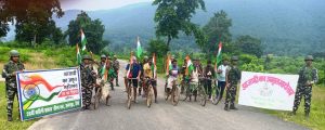 खूंटी. आजादी के अमृत महोत्सव के तहत 26 वाहिनी सशस्त्र सीमा बल के कमांडेंट के निर्देशन में मंगलवार को हर घर घर तिरंगा अभियान का आयोजन किया गया. इसके तहत भव्य तिरंगा रैली का आयोजन किया गया. कार्यक्रम के दौरान डी समवाय उलिहातू द्वारा उलिहातू और कंदरापीढ़ी में पैदल तिरंगा यात्रा और बाइक रैली निकाली गयी. ई समवाय, मटकमडीह द्वारा घाटडूलमी गांव में पैदल और बाइक तिरंगा रैली का आयोजन किया गया. जी समवाय, रायजमा द्वारा ग्राम कंदरकुटी से पांडाडीह तक साइकिल तिरंगा यात्रा निकाली गयी. इन सभी कार्यक्रमों में ग्रामीणों और बच्चों ने उत्साहपूर्वक भाग लिया.