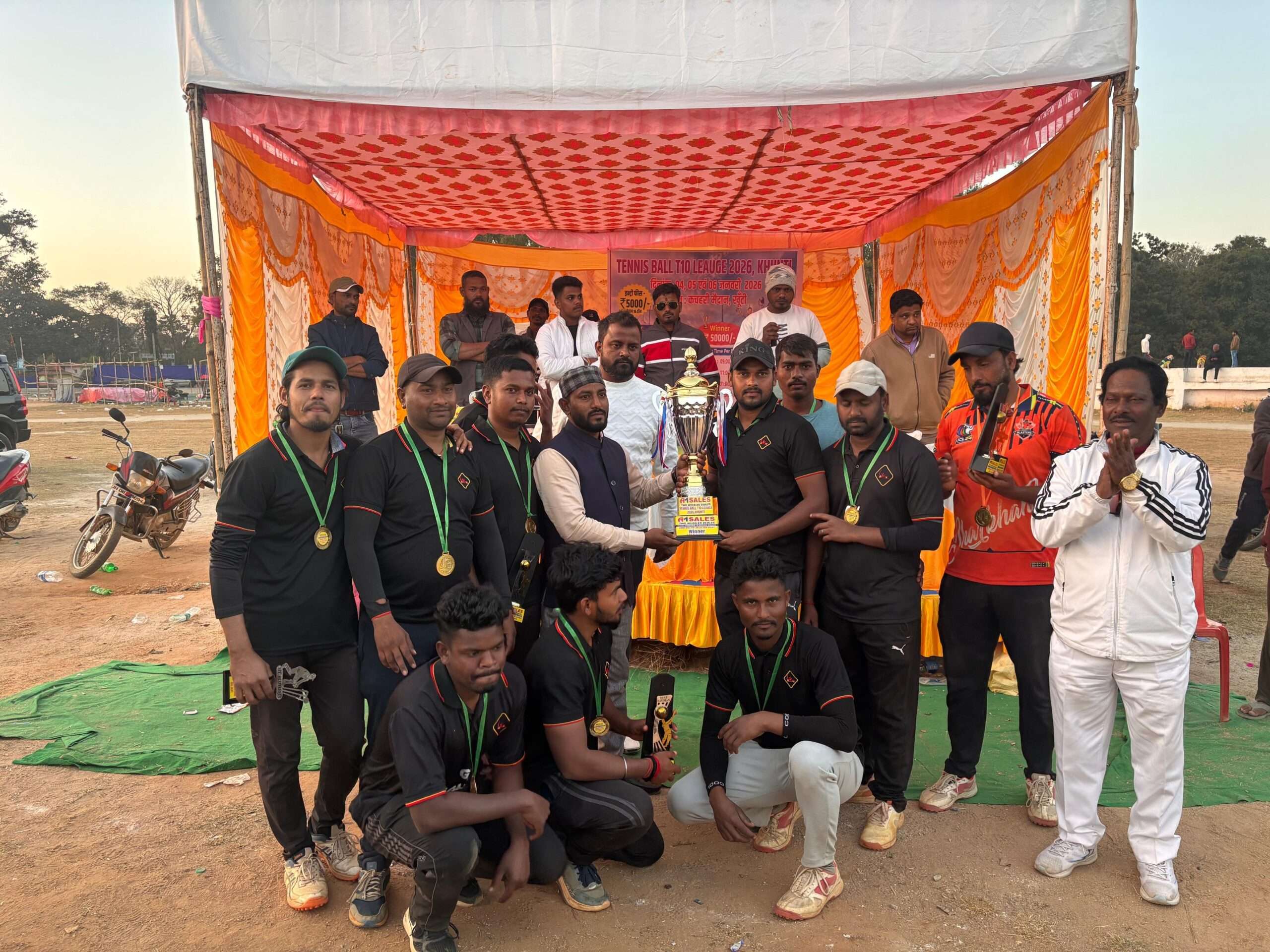 खूंटी. स्थानीय कचहरी मैदान में आयोजित टेनिस बॉल क्रिकेट टी-10 लीग 2026 का बुधवार को समापन हुआ. प्रतियोगिता के फाइनल मैच में जीके फाइटर और एफवाईसी कर्रा के बीच खेला गया. जिसमें जीके फाइटर की टीम 36 रनों से विजयी हुई. मैन ऑफ द मैच और मैन ऑफ द सिरीज अजहर खान को प्रदान किया गया. मुख्य अतिथि युवा कांग्रेस जिलाध्यक्ष आमिर हुसैन ने विजेता और उपविजेता टीम को पुरस्कृत किया. उन्होंने खिलाड़ियों को संबोधित करते हुये कहा कि इस तरह के खेल आयोजन युवाओं को सकारात्मक दिशा देने के साथ-साथ खेल भावना और अनुशासन को बढ़ावा मिलता है. उन्होंने आयोजकों को सफल आयोजन के लिए बधाई दी. पार्थो मिश्र, संदीप गोप, जय कुमार साहू, उस्मान खान, आमिल आमिल अशरफ, परवेज खान, शफीख खान, लल्ला सहित अन्य उपस्थित रहे.