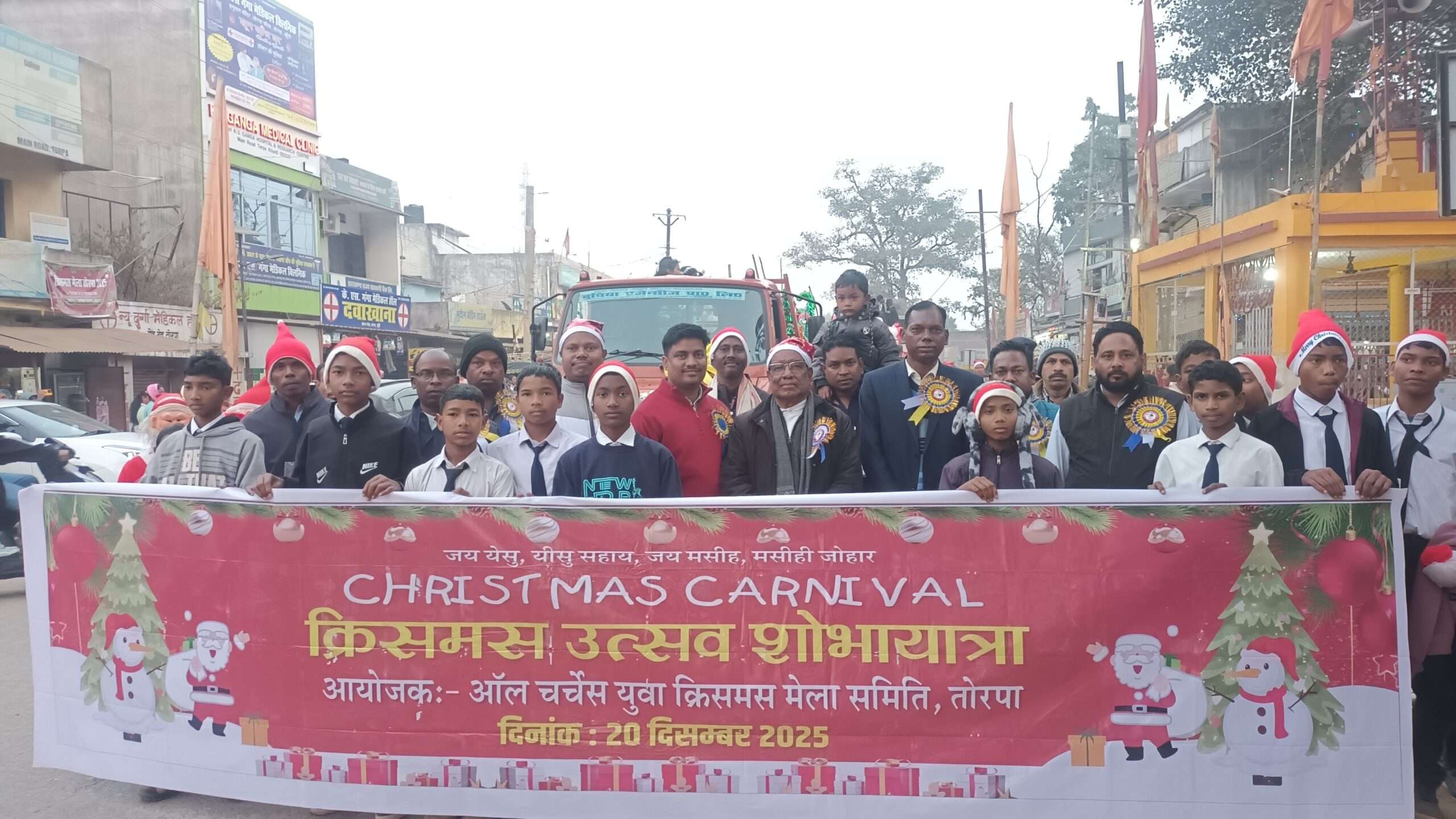 तोरपा. ऑल चर्चेस युवा क्रिसमस मेला समिति द्वारा शनिवार को तोरपा में क्रिसमस उत्सव शोभायात्रा निकाली गयी. शोभायात्रा में कैरोल गाये गये तथा क्रिसमस के गीतों पर युवक, युवती तथा महिला पुरुष जम कर थिरके. शोभायात्रा आरसी चर्च परिसर से शुरू हुई जो चर्च रोड, महावीर मंदिर चौक, मेन रोड होते हुए हिल चौक तक गयी. यहां से शोभायात्रा वापस लौट कर मेन रोड, कर्रा मोड़ होते हुए पेट्रोल पम्प तक गयी. यहां से शोभायात्रा ब्लॉक परिसर स्थित क्रिसमस मेला पहुंचकर समाप्त हो गयी. शोभायात्रा में शामिल लोग क्रिसमस के गीतों पर नाचते गाते चल रहे थे. फादर रवि पॉल एक्का व रजनी बागे की अगुवाई कैरोल गा रहे थे. शोभयात्रा में प्रभु येशु के जन्म की झांकी भी प्रस्तुत की गयी थी. शोभयात्रा में शामिल लोग बालक येशु की जय का जयकारा लगा रहे थे.