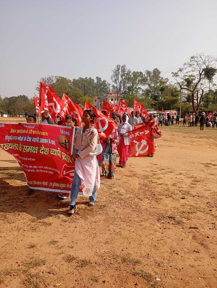 खूंटी. किसान आंदोलन की पांचवीं वर्षगांठ के अवसर पर बुधवार को संयुक्त किसान मोर्चा के देशव्यापी आह्वान पर खूंटी में संयुक्त किसान मोर्चा झारखंड द्वारा जुलूस निकाला गया. इसके तहत खूंटी कचहरी मैदान से समाहरणालय तक जुलूस निकाला गया. इसके बाद प्रधानमंत्री नरेंद्र मोदी और मुख्यमंत्री हेमंत सोरेन के नाम उपायुक्त को ज्ञापन सौंपा गया. जिसमें किसानों के लिए एमएसपी की कानूनी गारंटी देने, किसान आंदोलन और केंद्र सरकार के समझौते को लागू करने, पंचायत स्तर पर धान क्रय केंद्र खोलने, लेबर कोड रद्द करने, किसानों का कर्ज माफ करने, हाथियों के आतंक से निजात दिलाने सहित अन्य मांगों को रखा. मौके पर प्रदीप गुड़िया, कल्याण गुड़िया, राखोहरी चौधरी, सदानंद स्वांसी, संतोष ब़ोदरा, महादेव मुंडा सहितअन्य उपस्थित रहे.