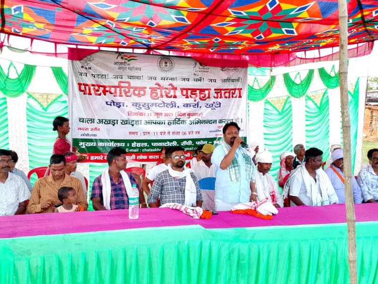 प्रखंड के पोड़ा कुसुमटोली में बुधवार को चाला अखड़ा खोड़हा ने पारंपरिक होरो पड़हा जतरा का आयोजन किया. पारंपरिक होरो पड़हा जतरा में मुख्य अतिथि खूंटी विधायक राम सूर्या मुंडा ने उपस्थित लोगों का अभिनंदन किया. कहा कि पारंपरिक पड़हा जतरा के माध्यम से लोकनृत्य, खोड़हा नृत्य, सांस्कृतिक वेशभूषा, खानपान, अखड़ा, सरना, मसना को बचाये रखना है. झारखंड सरकार अभी खोड़हा मंडली को बचाये रखने के लिए सभी खोड़हा मंडली को ढोल व मांदर देने की तैयारी में जुटी हुई है. जतरा में खूंटी, रांची, गुमला, लोहरदगा जिला से आये अलग-अलग खोड़हा मंडली ने पारंपरिक सांस्कृतिक नृत्य प्रस्तुत किया. होरो पड़हा जतरा को सफल बनाने में मुख्य संयोजक होरो पड़हा देवान उप राजा सुनील होरो, संयोजक मंदरा उरांव, चाला अखड़ा खोड़हा अध्यक्ष सह पूर्वी सांस्कृतिक केंद्र सदस्य बंदी उरांव, कलाकार फागू मुंडा, दुर्गा मुंडा, बिरसमुनी, तेंबा कच्छप आदि ने सहयोग किया. मौके पर मनोज होरो, संदीप हेरेंज, जयमंगल मुंडा, अनूप कुजूर, चंदा पहान, अजीत मुंडा सहित अन्य उपस्थित थे.डिस्क्लेमर: यह प्रभात खबर समाचार पत्र की ऑटोमेटेड न्यूज फीड है. इसे प्रभात खबर डॉट कॉम की टीम ने संपादित नहीं किया है