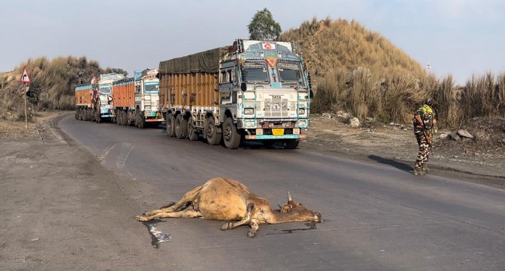 हाइवा की टक्कर से गाय की मौत, सड़क जाम