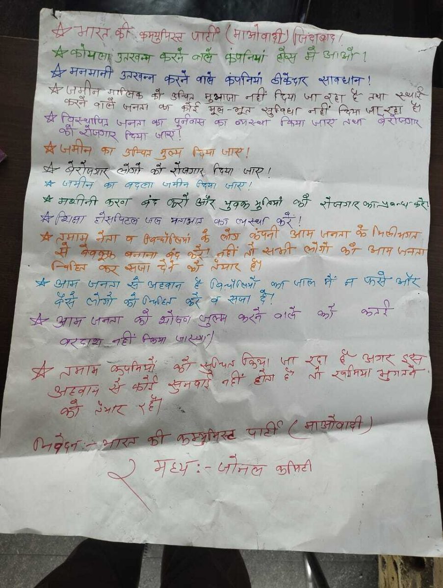 लातेहार व चतरा जिला के सीमावर्ती क्षेत्र के मगध कोलियरी अंतर्गत कुंडी माइंस के समीप भाकपा माओवादी के नाम पर हस्तलिखित पोस्टर चिपकाया गया है.