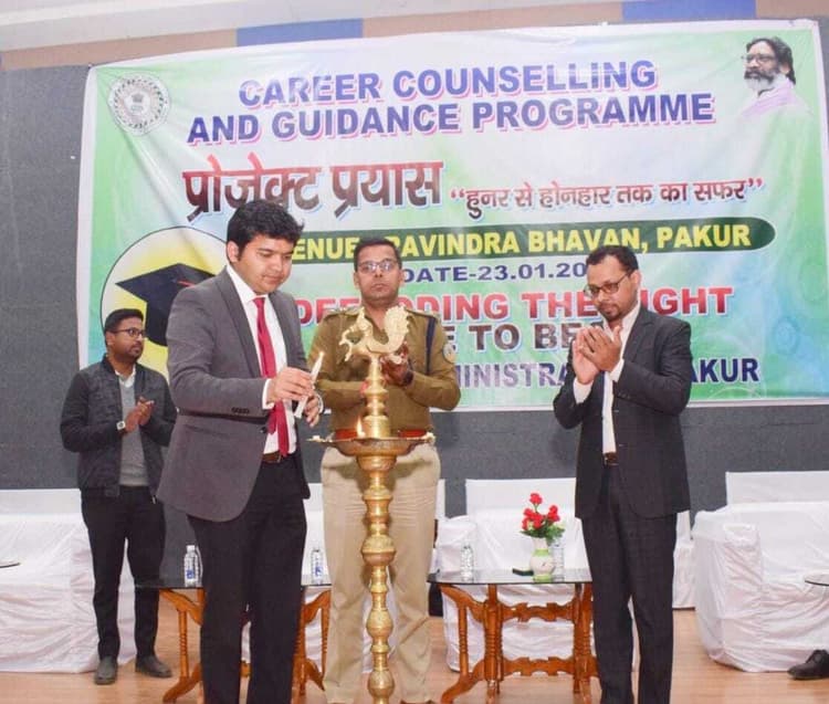 पाकुड़ नगर. जिला प्रशासन की ओर से प्रोजेक्ट प्रयास-हुनर से होनहार तक का सफर के तहत रवींद्र भवन टाउन हॉल में करियर काउंसलिंग सह गाइडेंस कार्यक्रम का आयोजन किया गया. इस कार्यक्रम की शुरुआत उपायुक्त मनीष कुमार व पुलिस अधीक्षक प्रभात कुमार एवं उप विकास आयुक्त महेश कुमार संथालिया ने की. डीसी ने कहा कि सपने एक दिन में पूरे नहीं होते, इसके लिए निरंतर प्रयास करने की जरूरत है. हमें यह तो पता है कि हमें क्या बनना है, लेकिन कैसे बनना यह भी मालूम होना चाहिए. कहा कि आपके लाइफ में महत्वपूर्ण क्या है, यह जानना बहुत जरूरी है. उन्होंने छात्रों को लक्ष्य निर्धारण करने और उसे प्राप्त करने के लिए दृढ़ संकल्पित रहने की सलाह दी. एसपी ने विद्यार्थियों को जेएसएससी, जेपीएससी, यूपीएससी, एसएससी, डिफेंस, रेलवे, बैंकिंग की ओर से ली जाने वाली विभिन्न प्रतियोगी परीक्षा की तैयारी को लेकर बेहतर समय प्रबंधन, सही दिशा में तैयारी के लिए उचित मार्गदर्शन बिंदुओं पर जानकारी दी. कहा कि आज प्रत्येक छात्र को अपने करियर के प्रति सचेत रहने की आवश्यकता है. उन्हें शुरुआत में ही लक्ष्य निर्धारित कर आगे बढ़ना चाहिए, ताकि समय से सफलता मिल सके. डीडीसी ने कहा कि बच्चों का करियर बनाने में माता-पिता का योगदान बहुत ही अहम होता है. बच्चों की इच्छा शक्ति की प्रेरणा स्रोत आपके माता-पिता है इनका सम्मान करें. जिला परिवहन पदाधिकारी संजय पीएम कुजूर ने सभी छात्रों से अपील की कि दोपहिया वाहन चलाते समय हेलमेट का उपयोग जरूर करें. स्पीड लिमिट में ही बाइक चलाएं. उन्होंने बताया कि राष्ट्रीय मतदाता दिवस एवं सड़क सुरक्षा सप्ताह को लेकर मैराथन दौड़ का आयोजन शुक्रवार को किया जायेगा.