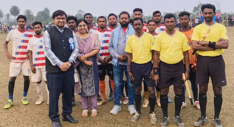 पाकुड़िया. जूनियर किसान क्लब डुमरसोल के तत्वावधान में डुमरसोल फुटबॉल मैदान में रविवार को तीन दिवसीय फुटबॉल टूर्नामेंट का फाइनल मैच खेला गया. मैच में बतौर मुख्य अतिथि जिला परिषद अध्यक्ष जूली खृष्टमणी हेंब्रम, झामुमो नेत्री उपासना मरांडी पहुंची. क्लब के सदस्यों व ग्रामीणों ने पारंपरिक आदिवासी रीति-रिवाज से सभी अतिथियों का स्वागत किया. वहीं अतिथियों ने फुटबॉल में किक मारकर मैच प्रारंभ किया. जिप अध्यक्ष ने खेल से संबंधित एवं झारखंड सरकार की ओर से चलायी जा रही जनकल्याणकारी योजनाओं की जानकारी खिलाड़ियों व ग्रमीणों को दी. क्लब के अध्यक्ष ब्रिनाल बास्की ने बताया कि टूर्नामेंट में कुल 16 टीमों ने हिस्सा लिया है. फाइनल फुटबॉल मैच एफसी चम्पागढ़ और बिंदास बॉयज दुमका के बीच खेला गया. इसमें एफसी चम्पागढ़ ने बिंदास बॉयज दुमका को एक गोल से हराकर जीत हासिल की. फाइनल विजेता टीम को प्रथम पुरस्कार 30 हजार रुपये नकद व उपविजेता टीम को 25 हजार रुपए देकर सम्मानित किया गया. अध्यक्ष श्री बास्की ने बताया कि स्पोर्ट्स में साइकिल रेस, मैराथन रेस, क्विज, डांस प्रतियोगिता का भी आयोजन किया गया. मौके पर मोतीलाल हांसदा, छोटू भगत, बप्पी टुडू, जीतवाहन राय, विजय हांसदा, महेंद्र टुडू, रमेश टुडू, सुलेमान सोरेन आदि खेल प्रेमी मौजूद थे.