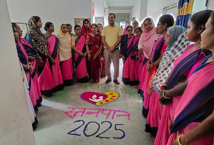 महेशपुर. प्रखंड के सीडीपीओ कार्यालय कक्ष में गुरुवार को बीडीओ सह सीडीपीओ सिद्धार्थ शंकर यादव ने महिला पर्यवेक्षिका एवं आंगनबाड़ी केंद्र की सेविकाओं के साथ बैठक की. बैठक में मुख्य रूप से 01 अगस्त से 07 अगस्त तक मनाए गए विश्व स्तनपान सप्ताह को लेकर विस्तारपूर्वक चर्चा की गयी. बताया गया कि नवजात बच्चे को जन्म के बाद छह माह तक मां का दूध अवश्य पिलाना चाहिए. इससे बच्चे के साथ-साथ मां को भी लाभ मिलता है. जच्चा-बच्चा दोनों को शारीरिक लाभ मिलता है तथा कई प्रकार की बीमारियों से सुरक्षित भी रहा जा सकता है. वहीं बैठक में एक बच्चे की मुंहजूठी भी बीडीओ सह सीडीपीओ सिद्धार्थ शंकर यादव ने करायी. इस अवसर पर स्तनपान सप्ताह को लेकर सेविकाओं द्वारा कार्यालय परिसर में रंगोली भी बनायी गयी थी. मौके पर महिला पर्यवेक्षिका तृप्ति भंडारी, कंप्यूटर ऑपरेटर उदय रविदास सहित दर्जनों सेविकाएं मौजूद थीं.