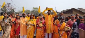 हिरणपुर. चौकीढाब गांव में चिंताहरण बाबा नाथ मंदिर समिति के तत्वावधान में सात दिवसीय श्रीमद्भागवत कथा सह संगीतमय प्रवचन को लेकर सोमवार को भव्य कलश यात्रा निकाली गयी. कलश यात्रा में कथावाचिका अनन्या शर्मा भी साथ-साथ चल रहीं थीं. इसमें बड़ी संख्या में कन्याएं, महिलाएं, पुरुष व बच्चे शामिल हुए. यात्रा के दौरान जय श्री राम, जय बजरंगबली की जयकारे से पूरा इलाका भक्तिमय हो गया. कलश यात्रा गांव से निकलकर तुरसाडीह, बरमसिया, हाथिगढ़ होते हुए पुनः गांव पहुंची. बरमसिया स्थित तालाब में मंत्रोच्चारण कर विधिवत रूप से कलश में जल भरा गया. संध्या से सात दिवसीय भागवत कथा का आयोजन किया जायेगा. मंदिर समिति के अध्यक्ष राजेंद्र प्रसाद साहा ने बताया कि 24 फरवरी से श्रीमद्भागवत कथा की शुरुआत होगी. 2 मार्च को कथा का विराम एवं 3 मार्च को पूर्णाहुति होगी. मौके पर कोषाध्यक्ष प्रह्लाद साहा, मुख्य यजमान डॉक्टर साहा एवं उनकी धर्मपत्नी, रामधन साहा, नारद साहा, देवेंद्र नाथ साहा, उमाशंकर साहा, लालमोहन साहा आदि मौजूद रहे.