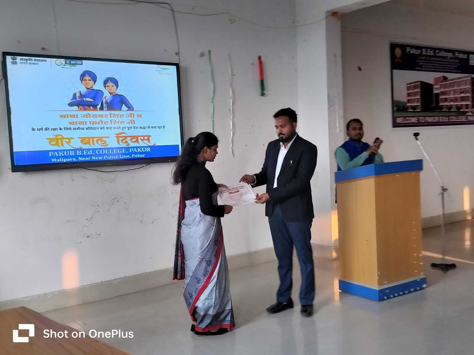 पाकुड़. पाकुड़ बीएड कॉलेज में गुरुवार को बीर बाल दिवस का आयोजन किया गया. इस दौरान पोस्टर मेकिंग, निबंध लेखन, पेंटिंग और भाषण प्रतियोगिता का आयोजन किया गया. इस प्रतियोगिता में राष्ट्रीय सेवा योजना के स्वयंसेवक, बीएड एवं डीएलएड के प्रशिक्षुओं ने हिस्सा लिया. पोस्टर मेकिंग में बीएड विभाग से मरियम शाहीन को प्रथम स्थान, जूली कुमारी को द्वितीय और रविशंकर प्रसाद को तृतीय स्थान प्राप्त हुआ. वहीं डीएलएड विभाग से संजीव कुमार साहा को प्रथम, कोमल कुमारी को द्वितीय और आशा कुमारी ने तृतीय स्थान प्राप्त हुआ. भाषण में बीएड विभाग से जयंत कुमार को प्रथम, सोनल कुमारी को द्वितीय व रविशंकर ने तृतीय स्थान प्राप्त किया. डीएलएड विभाग से प्रतिभा कुमारी को प्रथम, विवेक मंडल को द्वितीय और लक्ष्मण कुमार को तृतीय स्थान प्राप्त हुआ. निबंध में बीएड विभाग से बमबम सिंह को प्रथम, सोनल कुमारी को द्वितीय और गौतम कुमार को तृतीय स्थान प्राप्त हुआ. डीएलएड विभाग से प्रतिभा कुमारी को प्रथम, लक्ष्मण कुमार मंडल और ममोनी दास को द्वितीय व गौरी कुमारी को तृतीय स्थान प्राप्त हुआ. पेंटिंग में बीएड विभाग से चुमकी दत्ता को प्रथम, राकेश सिंह को द्वितीय और मासूम ने तृतीय स्थान प्राप्त किया. डीएलएड विभाग से शिल्पा-प्रथम, कोमल- द्वितीय और ममोनी ने तृतीय स्थान प्राप्त किया. इस अवसर पर महाविद्यालय के प्राचार्य डॉ संजय कुमार ने साहिबजादा बाबा जोरावर सिंह और बाबा फतेह सिंह को याद करते हुए बताया कि मुगल शासक सरहिंद के नवाब वजीर खान ने दोनों छोटे साहिबजादों को दीवार में जिंदा चुनवा दिया था. इन युवा साहिबजादो ने धर्म और मानवता के लिए अपना सर्वस्व न्योछावर कर दिया था. इस दौरान एनएसएस कार्यक्रम पदाधिकारी शंकर कुमार कुशवाहा आदि मौजूद थे.