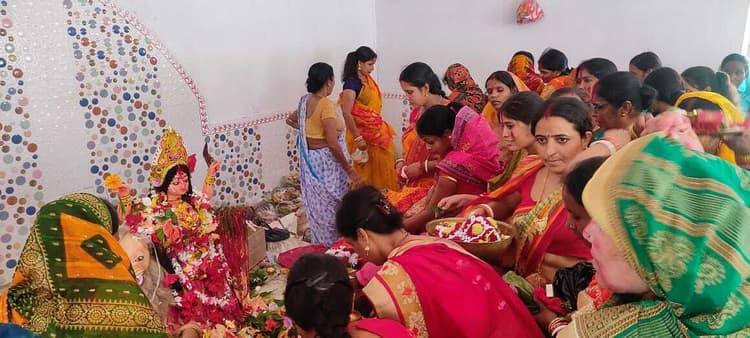 लिट्टीपाड़ा. प्रखंड के दुर्गा मंदिर में मंगलवार को परिवार की मंगल कामना के लिए महिलाओं ने श्रद्धा से देवी मां विपदतारिणी की पूजा-अर्चना की. मंदिर परिसर में पुरोहित लालू चक्रवर्ती द्वारा मां विपदतारिणी की प्रतिमा स्थापित कर पूजा-अर्चना की गयी. इस दौरान महिलाओं ने परिवार की रक्षा के लिए 13 प्रकार के फल, फूल, बेलपत्र का भोग लगाया. पूजा-अर्चना को लेकर महिलाओं में काफी उत्साह दिखा. पुरोहित लालू चक्रवर्ती ने बताया कि विपत्ति से छुटकारा पाने के लिए मां विपदतारिणी की पूजा की जाती है. महिलाएं 13 प्रकार के फूल व फल, मिठाई लाकर पूजा-अर्चना करती हैं. लाल धागा भी अपने थाल में लाती हैं. अपने परिवार की मंगल कामना करती हैं.