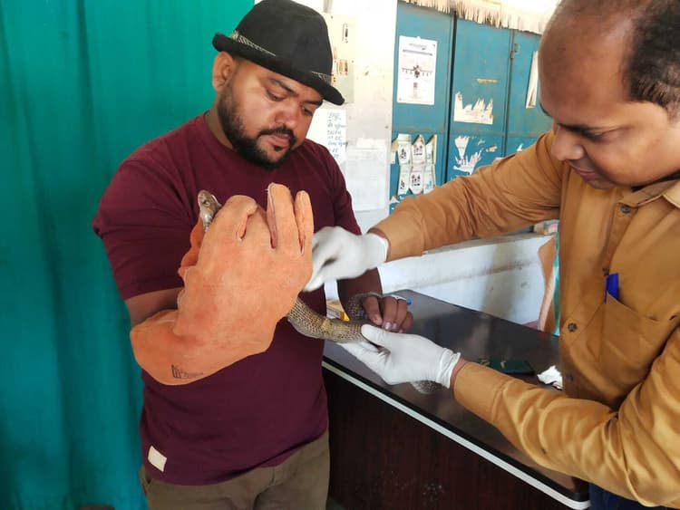 महेशपुर. घनश्यामपुर निवासी काली माल के घर में विशालकाय कोबरा सांप निकलने पर अफरा-तफरी मच गयी. इसी बीच गांव के कुछ लोगों ने सांप को लाठी-डंडों से सांप को भगाने के लिए जद्दाेजहद किया. पर कोबरा सांप दो दिनों से एक जाल में फंस गया था. सांप जख्मी हो गया. घटना की सूचना मिलते ही सर्प मित्र असराफुल शेख गांव पहुंचकर सांप को रेस्क्यू किया. इसके बाद सर्प मित्र ने सांप को इलाज के लिए पशु चिकित्सालय महेशपुर ले गया, जहां डॉ मनु जायसवाल ने कर्मी बेनाद के साथ मिलकर जख्मी सांप का इलाज किया.
