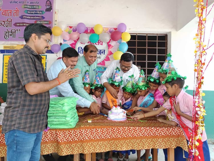 हिरणपुर. प्राथमिक विद्यालय हाथकाठी (हिन्दी) में सोमवार को भोजन सह जन्मोत्सव कार्यक्रम बच्चों के लिए यादगार बन गया. विद्यालय परिसर को रंग-बिरंगे गुब्बारों से सजाया गया था. इस अवसर पर कक्षा 3, 4 और 5 के विद्यार्थियों के बीच पुस्तकें वितरित की गयी. कार्यक्रम की खास बात यह रही कि जन्मदिन मना रहे बच्चों के साथ सामूहिक रूप से केक काटा गया, जिससे बच्चों में खास उत्साह देखा गया. उनके चेहरे पर खुशी और उमंग साफ झलक रही थी. कार्यक्रम में बीडीओ दिलीप टुडू, बीपीओ ट्विकल चौधरी, किशन भगत, बीआरपी संजय एवं प्रधानाध्यापक दीपक साहा उपस्थित रहे. अतिथियों ने बच्चों को पुस्तकें देते हुए शिक्षा के महत्व पर जोर दिया. कहा कि ऐसे आयोजन बच्चों को आगे बढ़ने की प्रेरणा देता है. अंत में सभी बच्चों के बीच स्वादिष्ट भोजन परोसा गया.