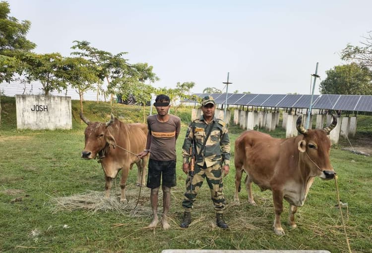 प्रतिनिधि, फरक्का. सीमा सुरक्षा बल (बीएसएफ) ने भारत-बांग्लादेश अंतर्राष्ट्रीय सीमा पर दो मवेशियों के साथ बांग्लादेशी निवासी एक तस्कर को गिरफ्तार किया है. बीएसएफ के अनुसार, मुर्शिदाबाद जिले के लालगोला थाना अंतर्गत खंडूया में बीते रविवार की रात्रि एक बांग्लादेशी घुसपैठी बीएसएफ को चकमा देकर अंतर्राष्ट्रीय सीमा पार कर मवेशी ले जा रहा था. इस दौरान बीएसएफ ने सक्रियता दिखाते हुए तस्कर, बांग्लादेश के चपाइनवाबगंज निवासी जुल्लू रहमान को मवेशियों के साथ गिरफ्तार कर लिया. पूछताछ के बाद उसे लालगोला थाना को सौंप दिया गया है.
