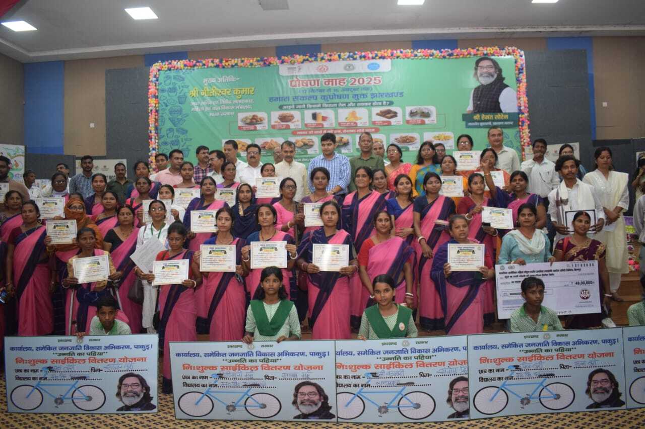 नगर प्रतिनिधि, पाकुड़. पोषण माह 2025 के समापन पर रविन्द्र भवन में कार्यक्रम हुआ. इसमें महिला एवं बाल विकास मंत्रालय, भारत सरकार के अपर सचिव एवं वित्तीय सलाहकार नीतीश्वर कुमार मुख्य अतिथि थे. डीसी ने जेएसएलपीएस दीदियों के लिए बर्तन वितरण की शुरुआत को महिला सशक्तीकरण की दिशा में महत्वपूर्ण बताया. उन्होंने सेविकाओं के सेवा भाव को सराहा और पाकुड़ जिले की प्रगति पर प्रकाश डाला. प्रोजेक्ट बदलाव, जागृति, बचपन और परख को जिले की पहचान बताया. अपर सचिव ने पाकुड़ जिला प्रशासन की टीम भावना की प्रशंसा की. उन्होंने स्वास्थ्य और शिक्षा में सुधार की बात कही, पर डॉक्टरों की कमी को चुनौती बताया. उन्होंने पाकुड़ जिले की प्रगति पर विश्वास जताया.