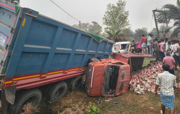 प्रतिनिधि, पाकुड़. नगर थाना क्षेत्र के सोलाहगड़िया गांव के समीप शुक्रवार को हाईवा (बीआर 46 जी 2148) और ट्रक संख्या (डब्ल्यू बी 57 05413) की आमने-सामने टक्कर हो गयी. टक्कर इतनी जोरदार थी कि हाईवा चालक गाड़ी की केबिन में ही फंसा रह गया, जिसमें उसे गंभीर रूप से चोटें आयी हैं. स्थानीय लोगों की सूचना पर नगर थाने की पुलिस ने हाईवा चालक को मशक्कत से हाइवा के केबिन बाहर निकाला गया. उसे सोनाजोड़ी सदर अस्पताल ले जाया गया. जानकारी के मुताबिक, हाईवा चालक जमुई जिला का राजीव कुमार बताया जा रहा है. हादसे के बाद कुछ देर तक सड़क पर यातायात भी प्रभावित रहा. ग्रामीणों ने बताया कि हाईवा बालू लेकर पाकुड़ की ओर आ रहा था, जबकि ट्रक पेवर ब्लॉक ईंटे लेकर हिरणपुर की ओर जा रहा था. इसी बीच यह दुर्घटना हुई. टक्कर के बाद हाईवा सड़क से नीचे उतर गया और ईंट लदा ट्रक पलट गया. नगर थाना प्रभारी अनिल कुमार गुप्ता ने बताया कि, घायल हाईवा चालक का इलाज चल रहा है. इसलिए अभी ज्यादा पूछताछ नहीं हो पायी है. स्थिति में सुधार होने के बाद पता लगाया जायेगा कि बालू कहां से लाया जा रहा था.