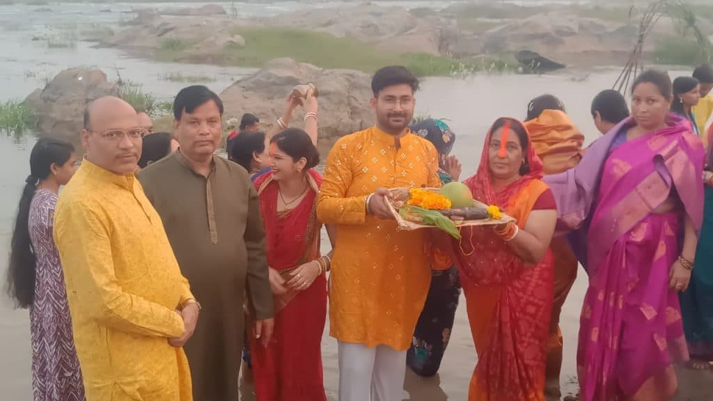 अमानत नदी के तट पर पलामू की एसपी रिष्मा रमेशन अपने पति अंजनी अंजन के साथ भगवान सूर्य को छठ का पहला अर्घ्य दिया.