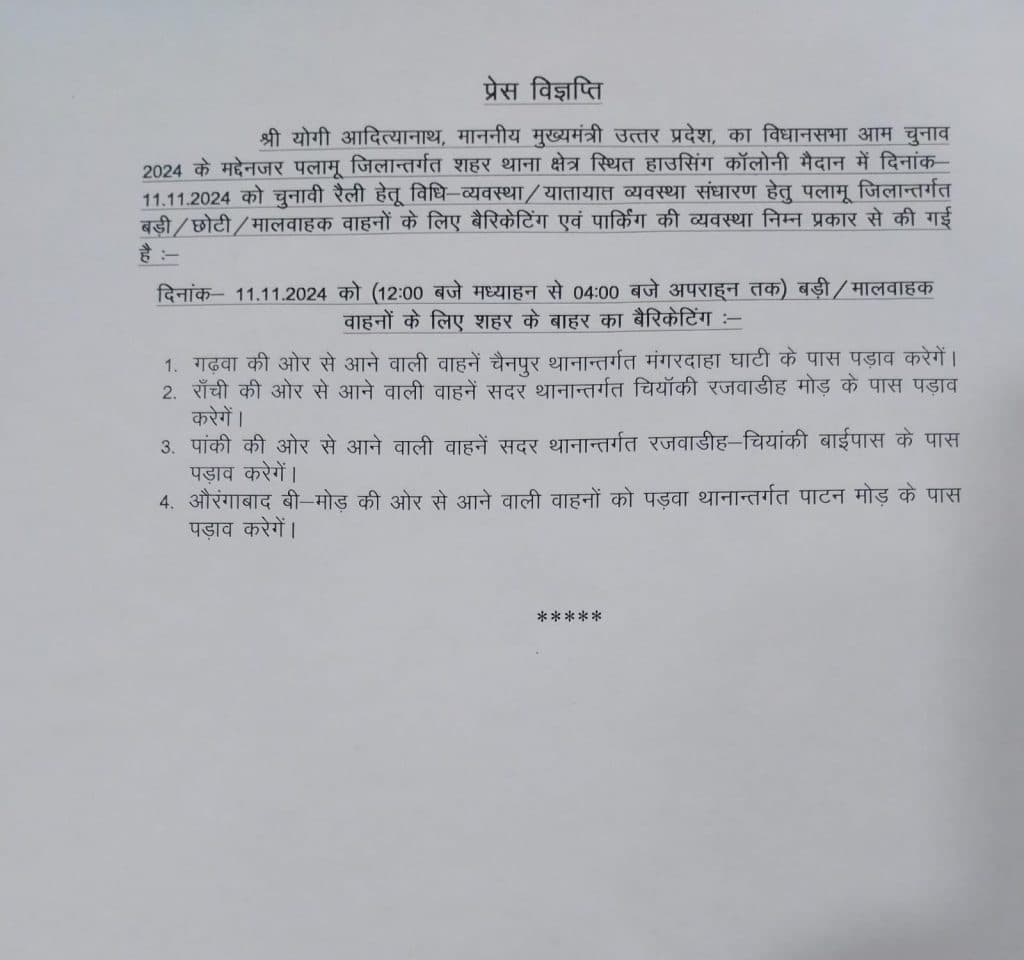 Jharkhand Election : पलामू एसपी ने योगी आदित्यनाथ की चुनावी सभा को देखते हुए ट्रैफिक व्यवस्था में कुछ बदलाव किए हैं.