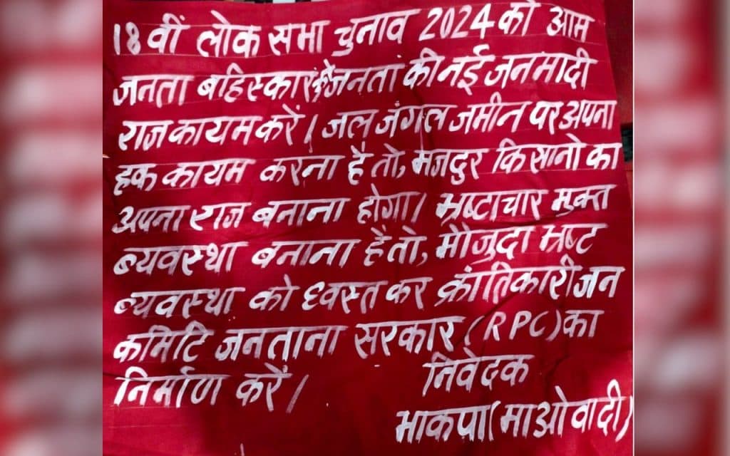 बैनर पर लिखा था- 18वीं लोकसभा चुनाव का आम जनता बहिष्कार करे. जनता की नई जनवादी राज्य कायम करें. जल जंगल जमीन पर अपना हक कायम करना है, तो मजदूर किसानों का अपना राज बनाना होगा. भ्रष्टाचारमुक्त व्यवस्था बनाना है, तो मौजूदा भ्रष्ट व्यवस्था को ध्वस्त कर क्रांतिकारी जन कमेटी जनता के सरकार का गठन करने की बात लिखे 7 बैनर के साथ एक की-पैड वाला मोबाइल फोन भी बरामद हुआ.