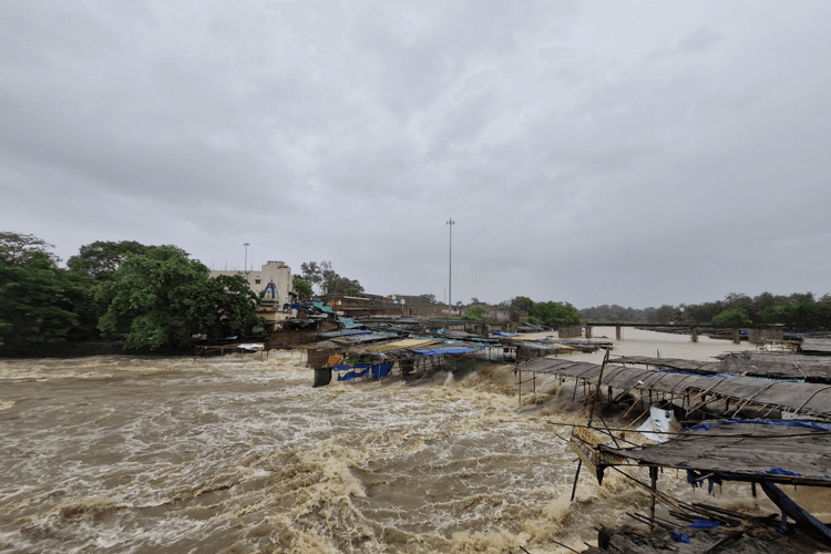 नदी किनारे स्थित दुकानों में घुसा पानी