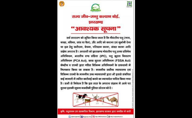 रांची : झारखंड सरकार ने बुधवार को एक विज्ञापन के माध्यम से आम लोगों को सूचित किया है कि किसी भी परिस्थिति में गोवंशीय पशु जैसे गाय, बैल, बछड़ा, सांड, ऊट आदि को काटने या कुर्बानी देने पर कड़ी पाबंदी लगा दी है. सरकार ने इस विज्ञापन में कहा है कि इस प्रकार के कृत्यों में संलिप्त व्यक्ति को केंद्र और राज्य द्वारा गठित विभिन्न अधिनियमों के तहत गिरफ्तार किया जा सकता है और उनपर मुकदमा चलाया जा सकता है.