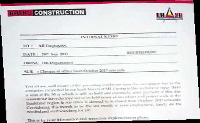 रांची : भानु कंस्ट्रक्शन कंपनी ने रांची के अरगोड़ा मुख्यालय स्थित कार्यालय को बंद करने का फैसला किया है. अक्तूबर से बंदी की सूचना जारी करते हुए कंपनी के मानव संसाधन विभाग ने अपने कर्मचारियों को दूसरी नौकरी तलाश करने का सुझाव दिया है. कंपनी ने अपने कार्यालय को बंद करने से संबंधित नोटिस 28 सितंबर को जारी किया.