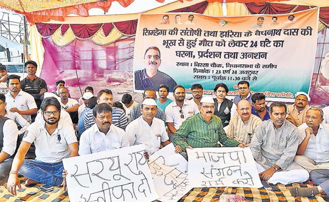 रांची: कांग्रेस ने सिमडेगा की संतोषी कुमारी और झरिया के रिक्शा चालक बैद्यनाथ दास की मौत को लेकर सरकार को घेरा है़ कांग्रेस ने आरोप लगाया है कि इन दोनों की मौत भूख से हुई है और सरकार तरह-तरह के बहाने बना रही है़ सोमवार को कांग्रेस महासचिव आलोक कुमार दुबे के नेतृत्व में बिरसा चौक के समीप कांग्रेसी 24 घंटे के उपवास पर बैठे है़ं.