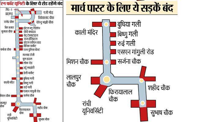 इस समय काली मंदिर से सुभाष चौक (रांची यूनिवर्सिटी) तक सभी प्रकार के वाहनों का प्रवेश बंद रहेगा़ इस दौरान चर्च रोड, बुधिया गली, बिष्णु गली, रूई गली, एसएन गांगुली रोड, पुरूलिया रोड से सर्जना चौक, चडरी से मेन रोड, अपर बाजार से शहीद चौक, श्रद्धानंद रोड से सुभाष चौक, कचहरी से शहीद चौक तक कोई वाहन नहीं चलेंगे.