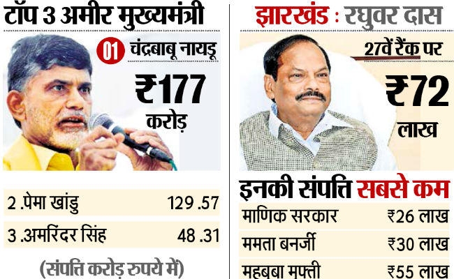 सूची में झारखंड के सीएम रघुवर दास का स्थान नीचे से (कम संपत्तिवाले सीएम में) पांचवां है. सबसे अमीर मुख्यमंत्रियों में चार कांग्रेस के हैं. ये हैं – पंजाब के मुख्यमंत्री अमरिंदर सिंह (48.31 करोड़), मेघालय के मुकुल संगमा (14.50 करोड़), कर्नाटक के सिद्दारमैया (13.61 करोड़) तथा मिजोरम के लाल थानवाला (9.15 करोड़).