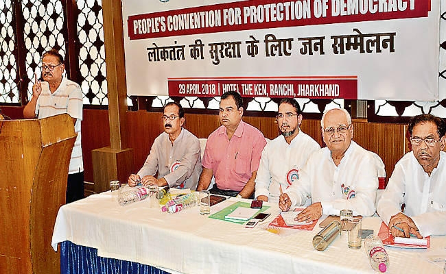 रांची : अलांयस फॉर जस्टिस एंड पीस के तत्वावधान में रविवार को मेन रोड स्थित होटल केन में जन सम्मेलन का आयोजन हुआ. इसका विषय था लोकतंत्र की सुरक्षा के लिए जनसम्मेलन. मौके पर मुख्य अतिथि के रूप में पूर्व जस्टिस बीजी कोलसे पाटिल ने कहा कि वर्तमान समय लोकतंत्र के लिए अभूतपूर्व संकट का है. खुलेआम संविधान बदलने की कोशिश की जा रही है. आदिवासियों, दलितों, मुसलमानों पर प्रहार किये जा रहे हैं. आदिवासियों की पहचान को हिंदू के साथ जोड़ा जा रहा है.