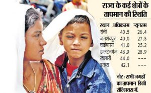 मौसम विभाग ने राजधानी का अधिकतम तापमान 40.5 डिग्री सेल्सियस और न्यूनतम तापमान 26.4 डिग्री सेल्सियस रिकाॅर्ड किया. डालटेनगंज का पारा 43.9 डिग्री सेल्सियस और जमशेदपुर का पारा 40 डिग्री सेल्सियस के पार रिकाॅर्ड किया गया. डालटेनगंज और आसपास के जिलों में बढ़ते तापमान के कारण पलामू टाइगर रिजर्व में एक चार साल के हाथी की मौत लू लगने से हो गयी.