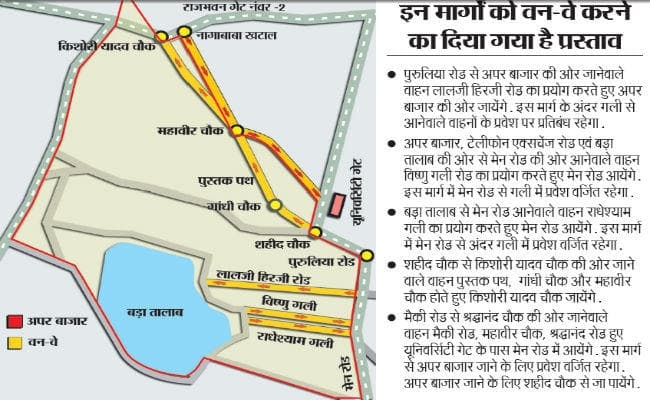 मैकी रोड से श्रद्धानंद चौक की ओर जानेवाले वाहन मैकी रोड, महावीर चौक, श्रद्धानंद रोड हुए यूनिवर्सिटी गेट के पास मेन रोड में आयेंगे. इस मार्ग से अपर बाजार जाने के लिए प्रवेश वर्जित रहेगा. अपर बाजार जाने के लिए शहीद चौक से जा पायेंगे.