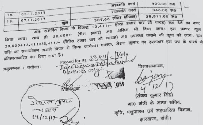 मंत्रिमंडल सचिवालय ने कृषि मंत्री की स्थापना कृषि प्रभाग निर्धारित किया है. इसलिए वह अपने अधीन पड़नेवाले पशुपालन और सहकारिता प्रभाग से अपनी गाड़ियों में डीजल-पेट्रोल नहीं ले सकते हैं. हालांकि मंत्रिमंडल सचिवालय के इस आदेश का उल्लंघन करते हुए कृषि मंत्री को-ऑपरेटिव बैंक से भी डीजल ले रहे हैं. डीजल और मरम्मत के नाम पर रौशन कुमार नामक व्यक्ति अग्रिम राशि लेता है. वह मंत्री की एक गाड़ी का ड्राइवर है.